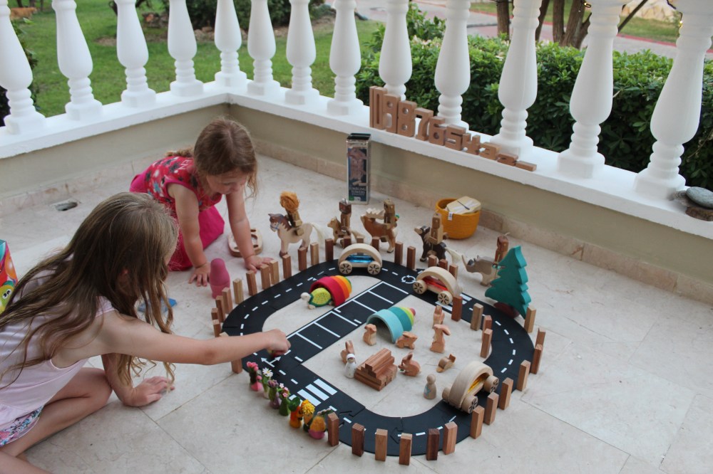 You will have seen it used on my instagram as part of small world play, construction set ups, used in combination with road mats or with our creatimber rocky board but bringing it on holiday has opened up play even further as we have used it poolside.