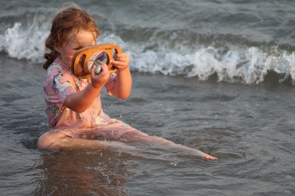 It is always in our outings bag and knowing that we might see unusual bugs or flowers on our holiday it had to come with us. Curiosity is a big part of the way my children learn and when we went to the beach the magnifying glass went into the sea with Miss 4 to investigate pebbles.