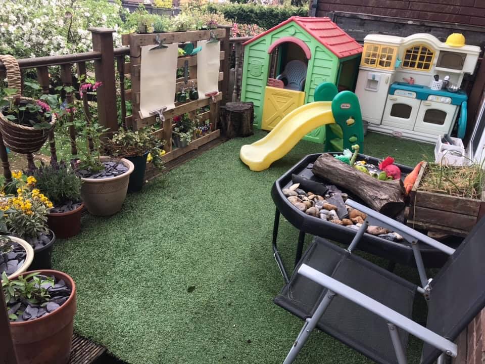 I created a nicer home corner and mud kitchen for the younger toddlers– close to the house and utilising our old play kitchen rather than it going tolandfill. With the addition of some pots and pans collected from the charityshop it is looking accessible and engaging.
