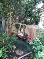 How amazing to create a den area. I had an area of my garden which wehad been clearing ready to plant up but decided to re dedicate this as a Denarea. I cleared some of the low hanging branches to make the area moreaccessible and cladded the fence with bamboo panelling. I was able to get somecrates from a local shop and we planted up some baskets with strawberries andscented flowers.
